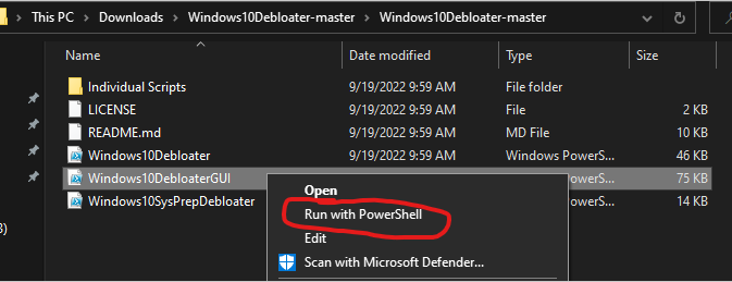 Extract the .zip, then right click click Windows10DebloaterGUI, and hit Run with Powershell