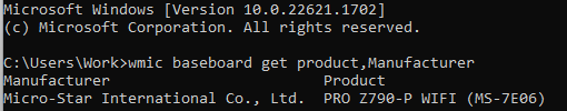 - Type 'wmic baseboard get product,Manufacturer' and press Enter. The command will return the manufacturer and model of your motherboard.